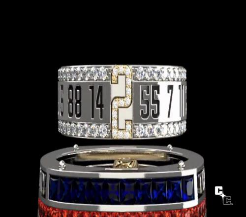 采用14K白金與黃金打造,鑲嵌藍(lán)橙雙色藍(lán)寶石。每枚戒指均以鉆石鑲嵌球員號碼。